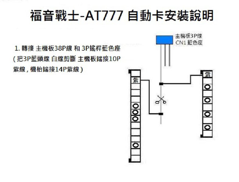 主機板38P線 和 3P搖桿藍色座 ( 把3P藍頭線 白線剪斷 主機板端接10P紫線 , 機枱端接14P紫線 )