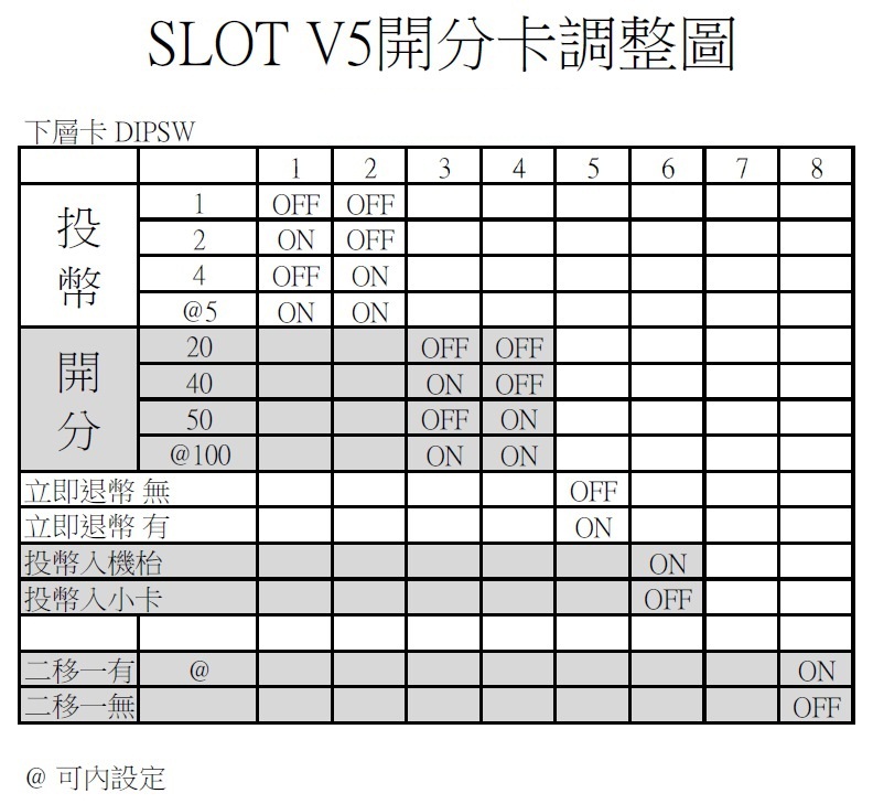 要設定"多投1" 把下板指撥 改為 1OFF 2OFF 5ON 6ON 8ON , 內設定把 "N移1"改為你要的數值 , 例如4投1 改為4 , 8投1 改為8
